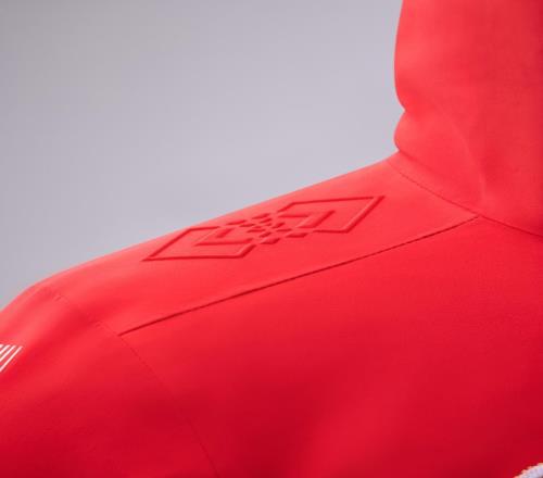 领奖服的背部辅助使用了蓬松的拒水鹅绒形成支撑,从而增加衣服整体空间,既能更好地保暖,也能加速把湿气从腋下透气位排出,以实现分区管理体温,帮助运动员在赛后快速透湿并锁温,保持动态保暖。而领奖服外层则采用了防水透湿膜,能抵御49mm-99mm的暴雨级别降水,实现防风、防水、透汽透湿等多重防护功能。