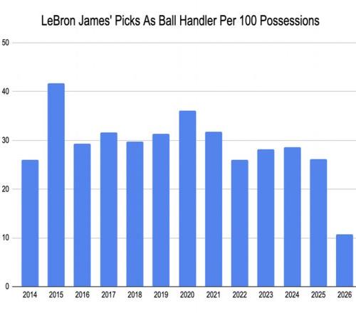 还有一组数据可以佐证这一观点:在Genius IQ数据库收录的詹姆斯近1000场比赛中,他单场挡拆次数不足5次的情况只出现过5次。其中一次发生在2013年11月,一次在2023年季后赛,另外三次均出现在本赛季。