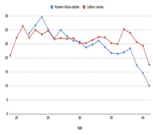 对于NBA历史上几乎任何其他球员而言,能征战至40岁以上便已是非凡成就,场均砍下17.6分更是前所未有的表现。此前,在41岁高龄仍能保有得分竞争力的传奇球星是卡里姆-阿卜杜尔-贾巴尔,他在41岁赛季场均贡献10.1分,而这已是其漫长职业生涯末期,状态逐步下滑后的结果。贾巴尔生涯最后一个场均得分24+的赛季,定格在他33岁之时。