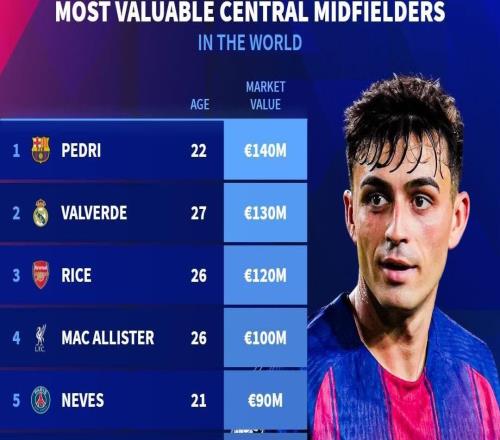 在完成最新一次身价更新后,德国转会市场网站列出了世界足坛中前卫身价榜,佩德里以1.4亿欧居首,巴尔韦德以1.3亿欧排名第二,赖斯以1.2亿欧位列第三。德转列世界足坛中前卫身价榜1